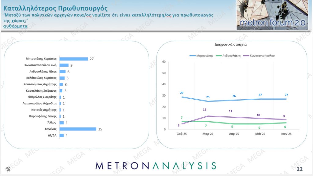 Στην καταλληλότητα για την πρωθυπουργία ο Κυριάκος Μητσοτάκης λαμβάνει 27% έναντι 9% της Ζωής Κωνσταντοπούλου που είναι δεύτερη παρά την απώλεια μία μονάδας και το αντίστοιχο κέρδος για τον Νίκο Ανδρουλάκη, ο οποίος καταγράφεται στο 6%. Η πρόεδρος της Πλεύσης παραμένει η δημοφιλέστερη πολιτική αρχηγός παρότι έχασε 4 μονάδες μέσα σε έναν μήνα. Σημειώνεται πάντως ότι ανάλογες απώλειες είχαν όλοι οι αρχηγοί των μεγαλύτερων κομμάτων, σύμφωνα με την Metron Analysis. Ο «Κανένας» παραμένει… νικητής με 35%.