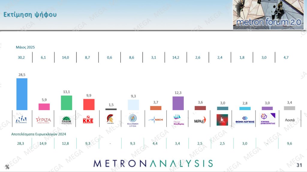 Στη δεύτερη θέση περνά το ΠΑΣΟΚ σύμφωνα με τη νέα δημοσκόπηση της Metron Analysis, ενώ η ΝΔ διατηρεί προβάδισμα στο ύψος του 15,4%.
