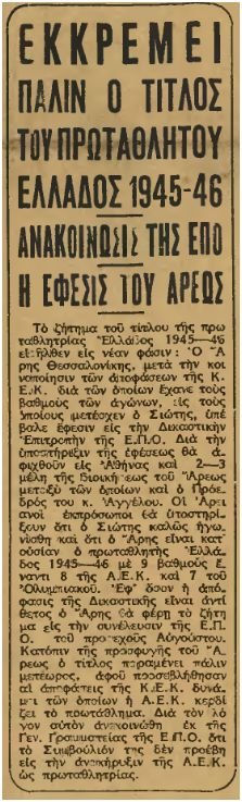Εν ολίγοις, ο Αρης πήρε το πρωτάθλημα από την ΑΕΚ, έχοντας χρησιμοποιήσει παίκτες που (βάσει απόφασης της ομοσπονδίας) δεν του άνηκαν! Η θιγόμενη, βέβαια, ήταν η προσφυγική και αδύναμη στα κέντρα αποφάσεων ΑΕΚ. Αν ο δεύτερος πίσω από τον Αρη ήταν ο Παναθηναϊκός ή ο Ολυμπιακός, δεν θα είχε πάρει κανένα πρωτάθλημα ο Αρης. Όπως δεν θα είχαν πάρει κανένα πρωτάθλημα ο ΠΑΟΚ το 1976 και το 1985 και η Λάρισα το 1988, αν σε κάθε περίπτωση η δεύτερη της βαθμολογίας και άμεση ανταγωνίστρια δεν ήταν η ΑΕΚ.