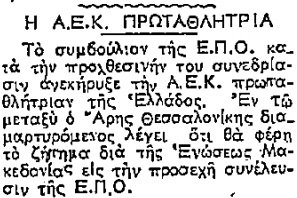 Η ΑΕΚ έμεινε στους οκτώ βαθμούς, έναν πίσω από τον Αρη, όμως τη στιγμή εκείνη μπορούσε να θεωρεί ότι ήταν πρωταθλήτρια, καθώς η ομάδα της Θεσσαλονίκης επρόκειτο να μηδενιστεί και στους τέσσερις αγώνες της με ΑΕΚ και Ολυμπιακό, αφού είχε χρησιμοποιήσει τους ποδοσφαιριστές Σιώτη και Γκότση, οι οποίοι είχαν αγωνιστεί στο πρωτάθλημα Θεσσαλονίκης της ίδιας σεζόν με τον Απόλλωνα Καλαμαριάς.
