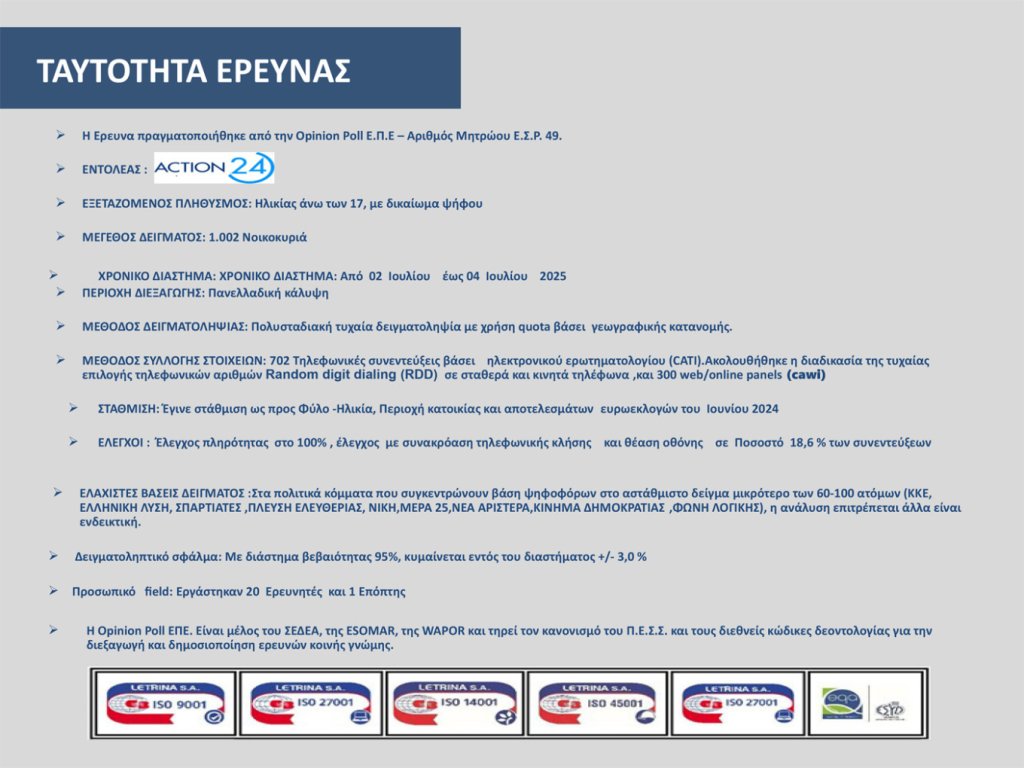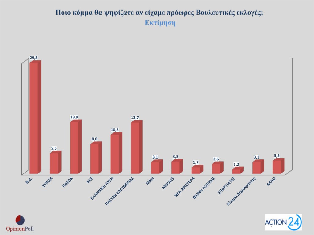 Συγκεκριμένα, στην εκτίμηση ψήφου, στη μέτρηση που παρουσιάστηκε στο κεντρικό δελτίο του Action 24, η ΝΔ καταγράφει 29.8% (από 30,4% τον Μάιο ), το ΠΑΣΟΚ 13.9% ( από 13.4%) και η Πλεύση Ελευθερίας 13.7% ( 16% τον Μάιο ). Ακολουθούν Ελληνική Λύση με 10.5% ( 9.6%), το Κ.Κ.Ε με 8% ( 8.2%), στην έκτη θέση ο ΣΥΡΙΖΑ με 5.5% ( 5.8%), το ΜεΡΑ25 με 3.3% ( 2.4%), η Νίκη με 3.1% ( 3%), το κόμμα Κασσελάκη με 3.1% ( 2.9%), η Φωνή Λογικής με 2.6%( 2.9%), η Νέα Αριστερά με 1.7% ( 1.2%) και οι Σπαρτιάτες με 1.2% ( 1%)