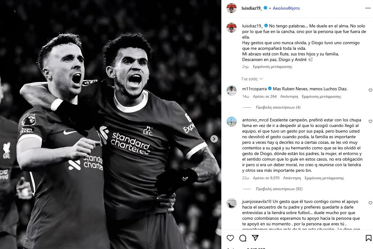 Επίσης, όταν έγινε γνωστή η τραγική είδηση του αδόκητου χαμού του Ζότα, ο Λουίς Ντίας κάνει την εξής ανάρτηση στον λογαριασμό του στο Instagram: "Δεν έχω λόγια… Πονάει η ψυχή μου. Όχι μόνο για αυτό που ήταν μέσα στο γήπεδο, αλλά και για το άτομο που ήταν έξω από αυτό. Υπάρχουν χειρονομίες που κανείς δεν ξεχνάει ποτέ, και ο Ντιόγκο είχε μία μαζί μου που θα μείνει μαζί μου για μια ζωή.