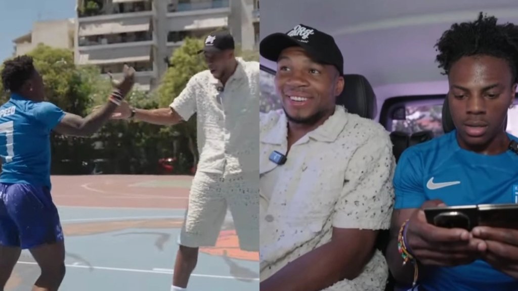 Αρχικά, οι δυο τους βρέθηκαν στο γνωστό ανοικτό γηπεδάκι του μπάσκετ που είναι ζωγραφισμένη η μορφή του Γιάννη, με τον Speed να εμφανίζεται με μια φανέλα της Εθνικής ομάδας και μάλιστα τόλμησε και κατάφερε να καρφώσει.