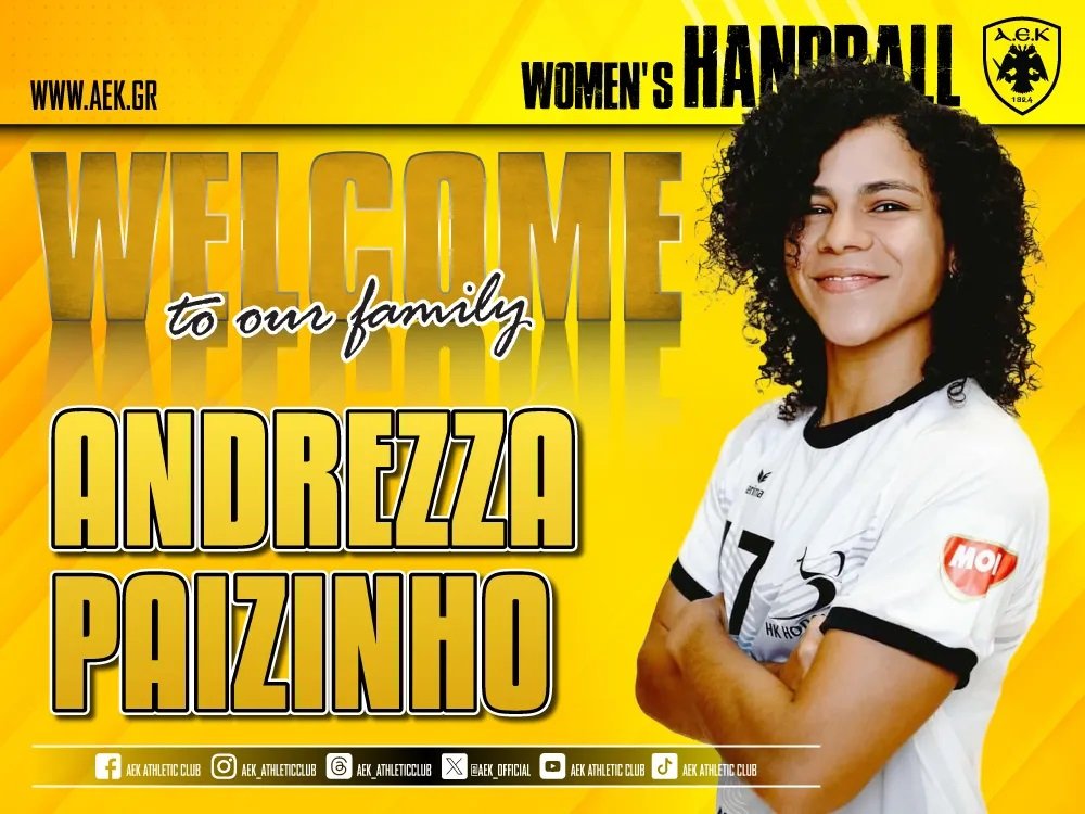 Η ΑΕΚ βρίσκεται στην ευχάριστη θέση να ανακοινώσει την έναρξη της συνεργασίας της με την Αντρέζα Παϊζίνιο Σάλες Ντος Σάντος. Η 26χρονη (12/08/1999) διεθνής Βραζιλιάνα πλέι μέικερ, υπέγραψε το συμβόλαιό της και εντάσσεται στο δυναμικό της γυναικείας ομάδας Χάντμπολ του Συλλόγου.