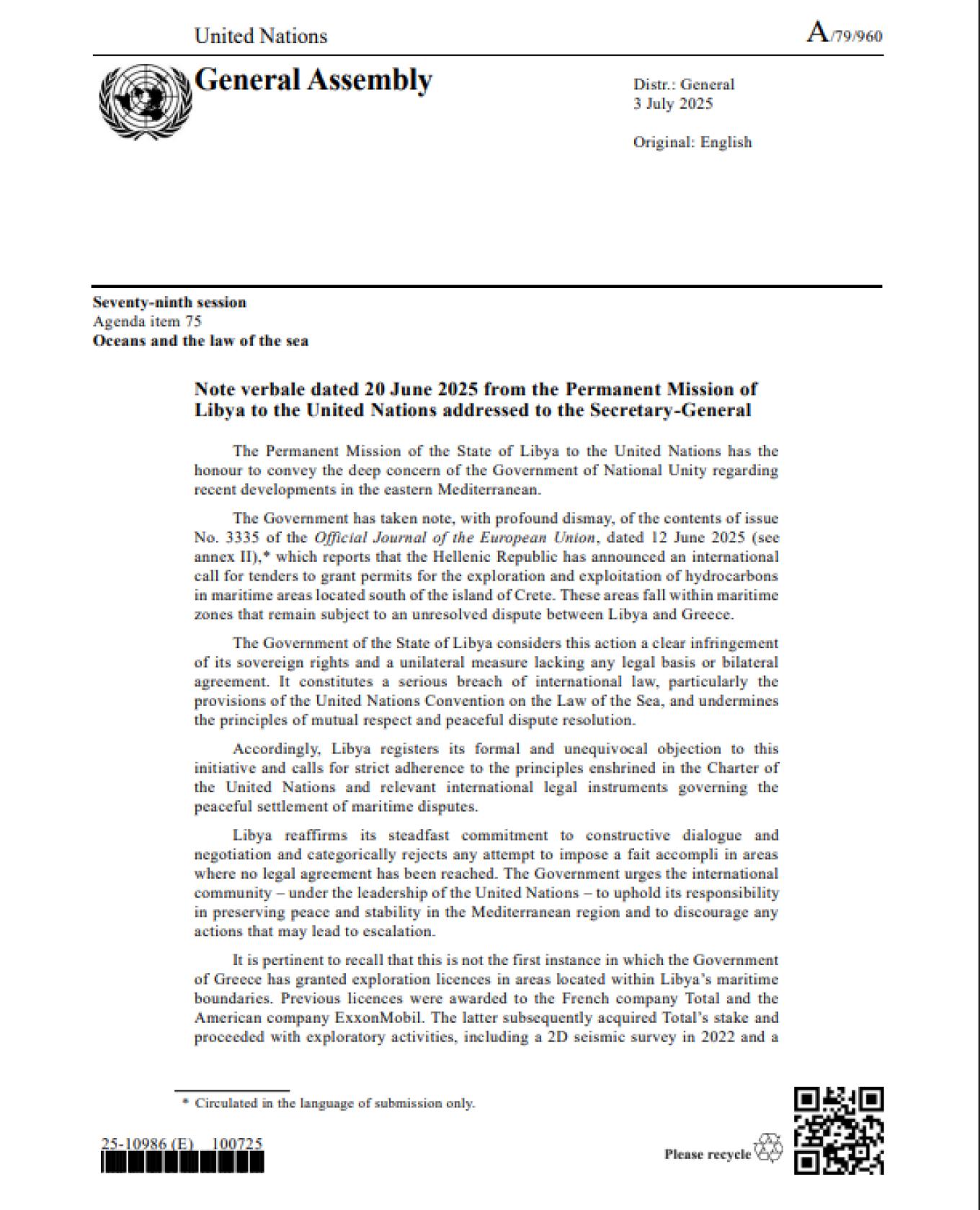 «Ρηματική διακοίνωση με ημερομηνία 20 Ιουνίου 2025 από τη Μόνιμη Αντιπροσωπεία της Λιβύης στον Οργανισμό Ηνωμένων Εθνών προς τον Γενικό Γραμματέα
