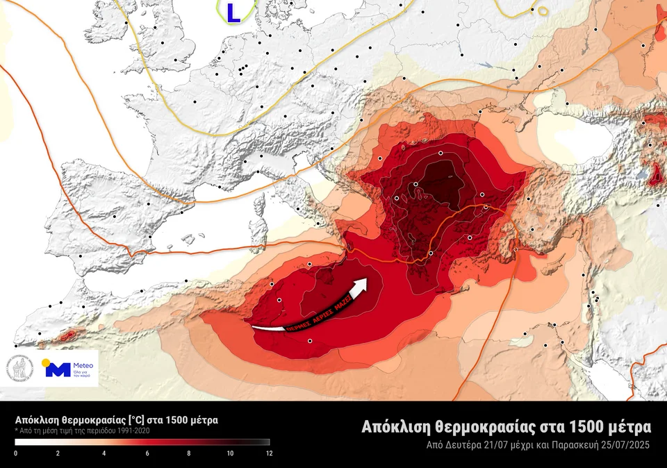 Όπως αποτυπώνεται σε χάρτη του meteo.gr / ΕΑΑ, η θερμοκρασία στο επίπεδο των *850 hPa(περίπου 1500 μέτρα από την επιφάνεια της θάλασσας) κατά το χρονικό διάστημα από τη Δευτέρα 21/07 μέχρι και την Παρασκευή 25/07 στα Βαλκάνια θα είναι έως και 10 βαθμούς υψηλότερη από τη μέση τιμή της περιόδου 1991-2020.