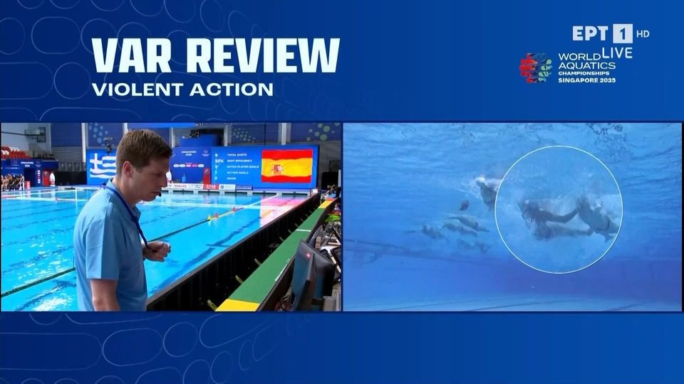 Με παίκτη λιγότερο έμεινε η Ελλάδα στην αναμέτρηση εναντίον της Ισπανίας, αφού ο διαιτητής απέβαλε τον Αριστείδη Χαλυβόπουλο για τέσσερα λεπτά. Ο ρέφερι εξέτασε το VAR για βίαιο χτύπημα σε αντίπαλο και έδειξε πέναλτι υπέρ της Ισπανίας