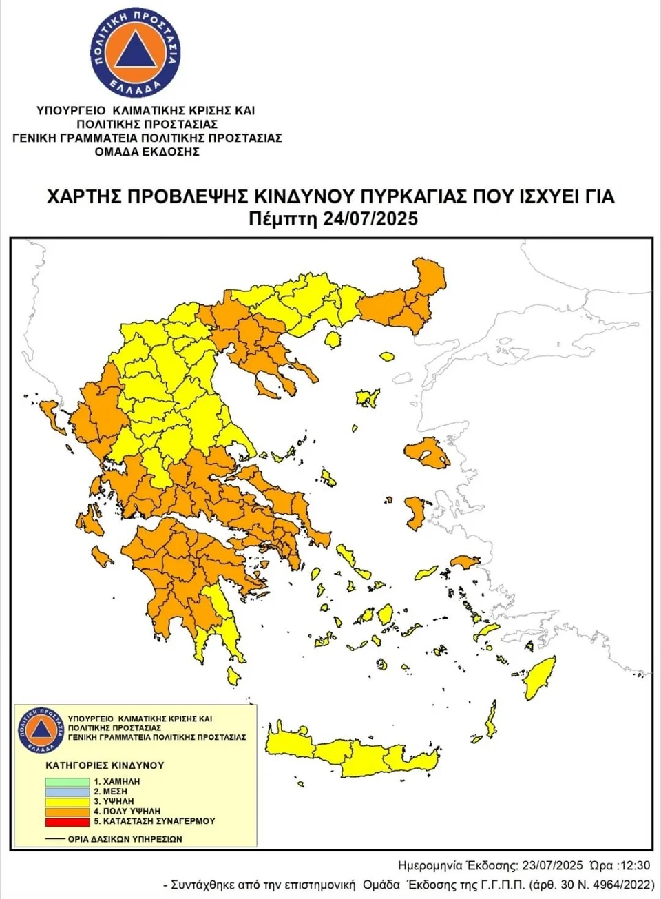 Πολύ υψηλός κίνδυνος πυρκαγιάς προβλέπεται αύριο (24/7) σε 10 περιφέρειες της χώρας λόγω του καύσωνα, σύμφωνα με το Χάρτη Πρόβλεψης Κινδύνου Πυρκαγιάς.