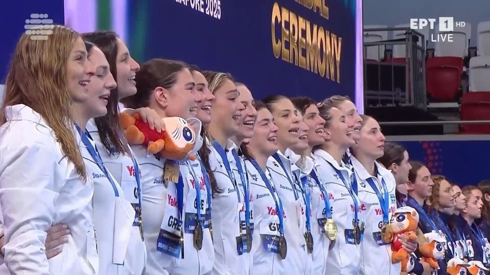 Η Εθνική Γυναικών σήκωσε στον αέρα την κούπα του Παγκοσμίου Πρωταθλήματος Υγρού Στίβου, με τις Ελληνίδες παίκτριες να τραγουδούν με μία φωνή τον εθνικό ύμνο της χώρας μας.