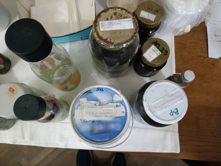 – μεγάλες ποσότητες υλικών που σχετίζονται με την παρασκευή πυρίτιδας, καθώς και πολυάριθμες συσκευασίες που περιείχαν είτε έτοιμη μαύρη πυρίτιδα (πλέον των 13 κιλών), είτε πρόδρομες χημικές ουσίες όπως νιτρικό κάλιο, θείο, ξυλάνθρακα, σκόνες μετάλλων (αλουμινίου, μαγνησίου), υγρά χημικά όπως μεθανόλη, διαιθυλαιθέρας