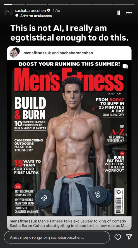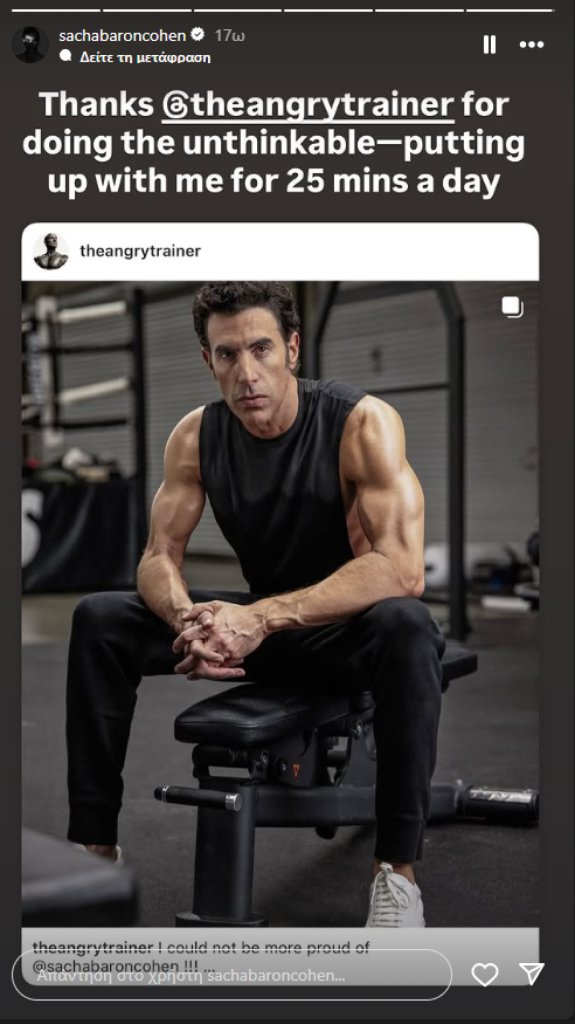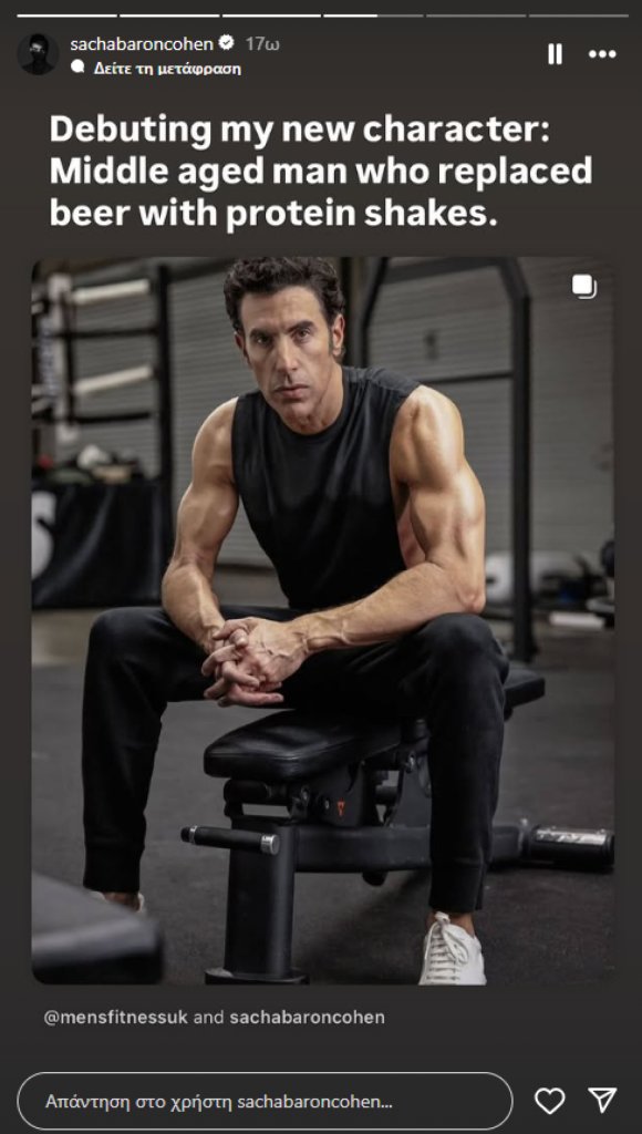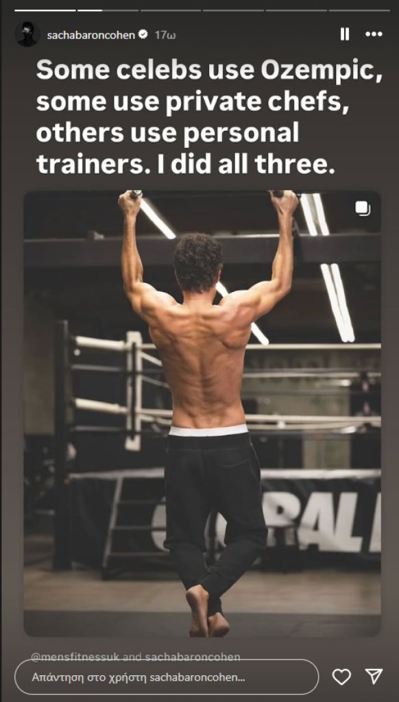 Έγραψε χαρακτηριστικά: «Κάποιοι διάσημοι χρησιμοποιούν Ozempic, άλλοι έχουν προσωπικούς σεφ, κι άλλοι γυμνάζονται με personal trainers... εγώ τα έκανα και τα τρία! Αυτό δεν είναι αποτέλεσμα τεχνητής νοημοσύνης. Είμαι όντως αρκετά εγωκεντρικός για να το κάνω αυτό. Παρουσιάζω τον νέο μου χαρακτήρα: Μεσήλικας που αντικατέστησε την μπύρα με πρωτεϊνούχα ροφήματα». Ο Σάσα ευχαρίστησε και τον προσωπικό του γυμναστή, γράφοντας: «Τον ευχαριστώ που έκανε το αδιανόητο – με άντεξε για 25 λεπτά την ημέρα».