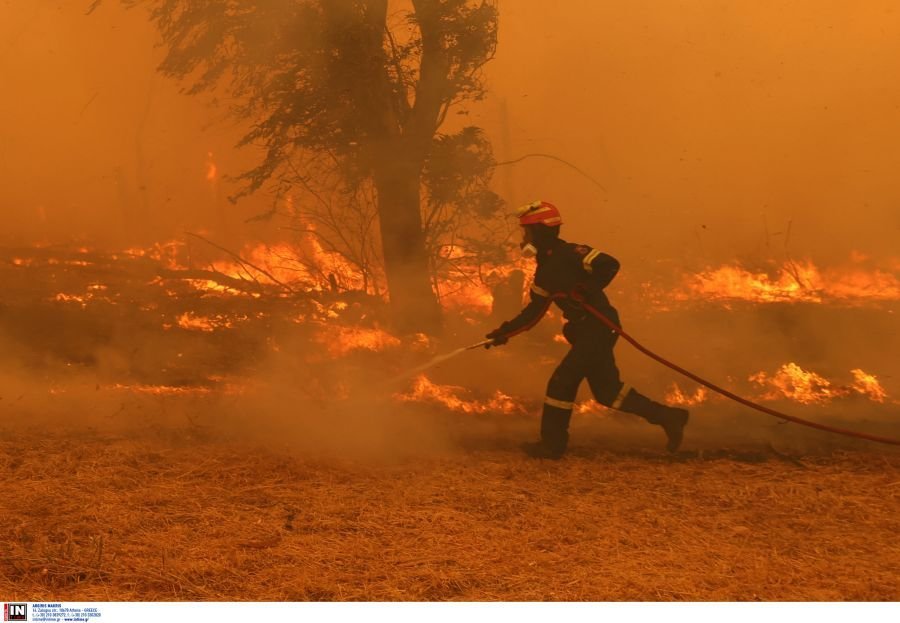 «Πολεμικό» είναι το κλίμα στο Κρυονέρι όπου μαίνεται η μεγάλη φωτιά. Κάτοικοι με λάστιχα στα χέρια προσπαθούν να σώσουν τις περιουσίες τους, τη στιγμή που ακούγονται εκρήξεις.