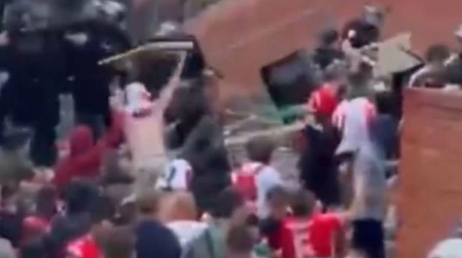 Μερίδα οπαδών φαίνεται να πετάει προς το μέρος των αστυνομικών διάφορα αντικείμενα, όπως τάβλες, καρέκλες, μέχρι και μία... σκάλα, με τους αστυνομικούς να απαντούν με ρίψη χημικών.