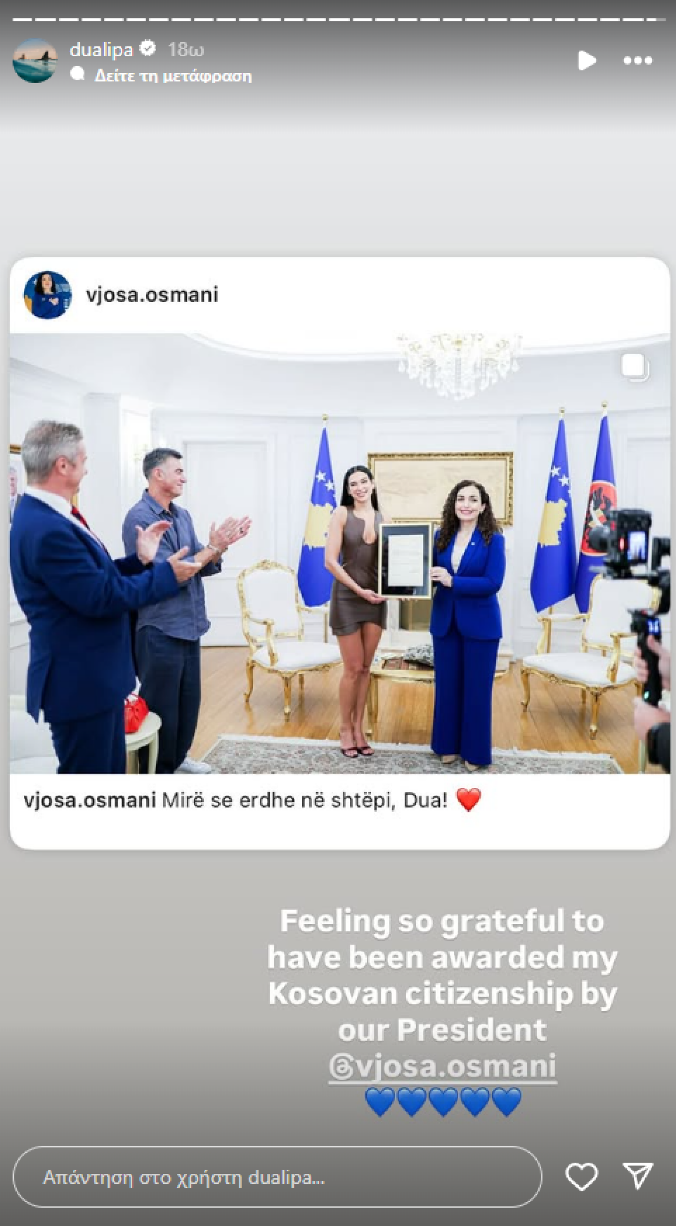 Σε ανάρτηση που έκανε η ποπ σταρ, μοιράστηκε τα συναισθήματά της: «Αισθάνομαι τόσο ευγνώμων που μου απονεμήθηκε η κοσοβάρικη υπηκοότητα από την πρόεδρό μας Βιόσα Οσμάνι».