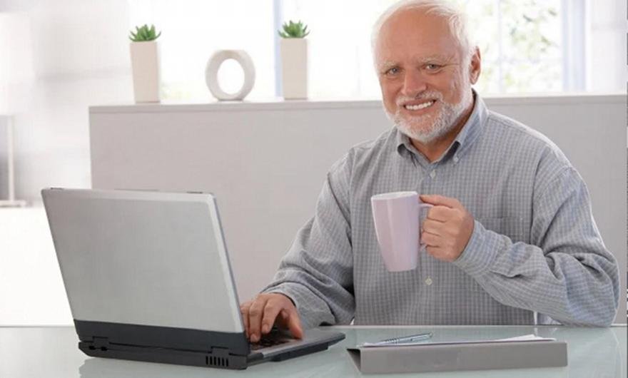 Το meme με τον κύριο που κάθεται, κρατώντας μια κούπα στο χέρι του, έχει μπροστά του έναν υπολογιστή και χαμογελά έχει γίνει viral στο διαδίκτυο με εκατομμύρια φωτογραφίες.