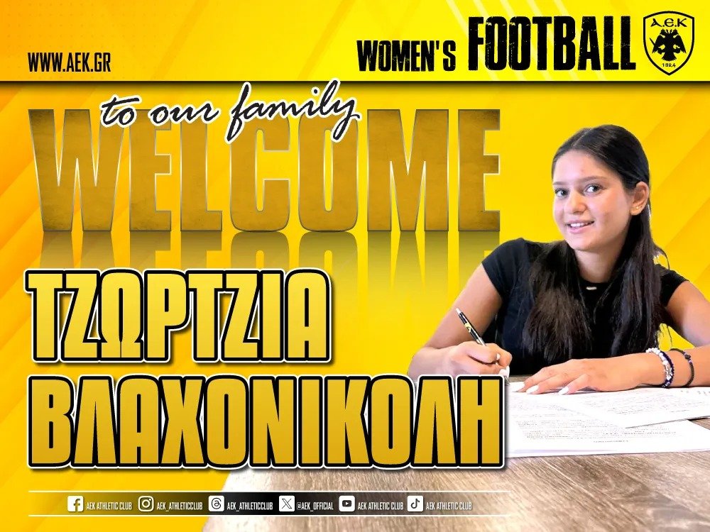 "Η ΑΕΚ βρίσκεται στην ευχάριστη θέση να ανακοινώσει την έναρξη της συνεργασίας της με την Τζώρτζια Βλαχονικολή. Η 16χρονη μεσοεπιθετικός υπέγραψε τετραετές συμβόλαιο και εντάσσεται στο δυναμικό της γυναικείας ομάδας Ποδοσφαίρου.