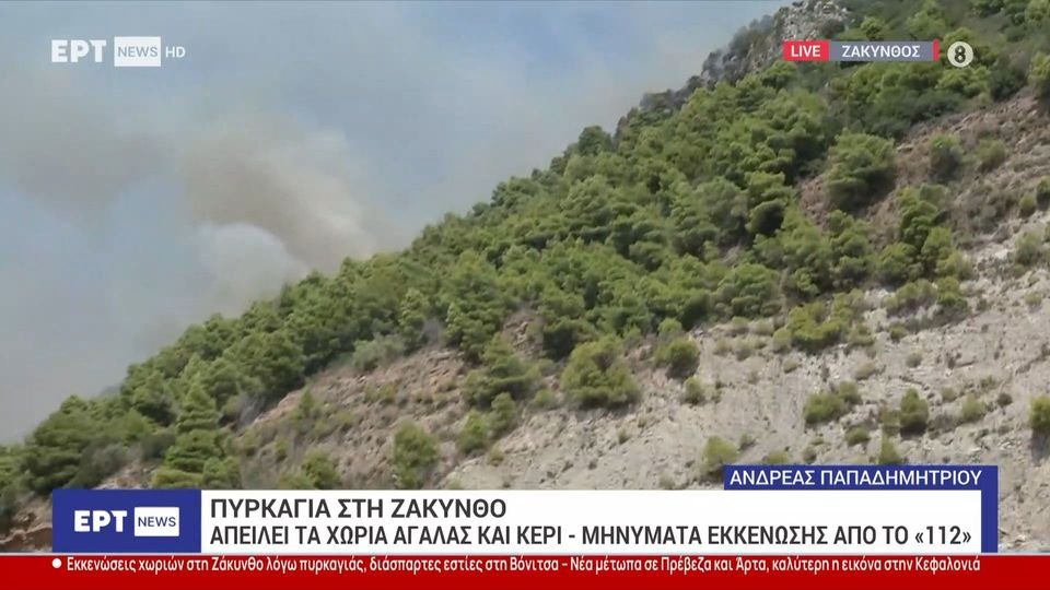 «H φωτιά είναι δίπλα σε σπίτια αυτή τη στιγμή, ολόκληρο το χωριό Αγαλάς απειλείται καθώς καίγεται το δάσος δίπλα του και οι φλόγες κατευθύνονται και προς το χωριό Κερί. Όλες οι πυροσβεστικές δυνάμεις εδώ. Η Πολιτική Προστασία, μηχανήματα έργων, τα πάντα, αλλά παρόλα αυτά έχει ισχυρούς ανέμους και είναι ανεξέλεγκτη η φωτιά», είπε στο ΕΡΤΝews, ο δήμαρχος Ζακύνθου, Γιώργος Στασινόπουλος.