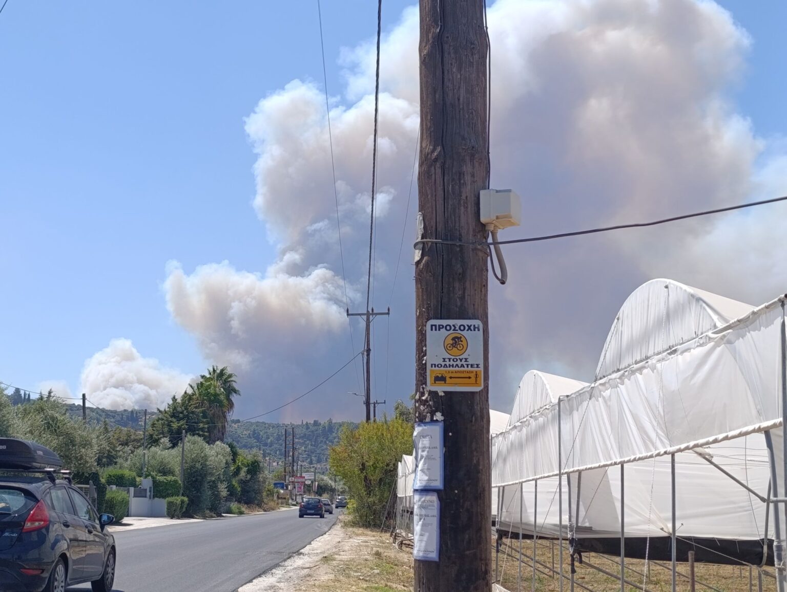 Οι φλόγες και οι καπνοί από την φωτιά είναι ορατοί από μεγάλη απόσταση, αναφέρει το dete.gr.