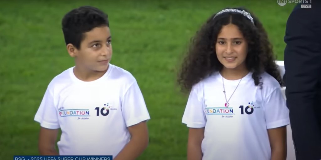 Two Palestinian refugee children are taking part in the medal ceremony alongside UEFA President Aleksander Čeferin at the 2025 UEFA Super Cup following an invitation from the @UEFA_Foundation for Children. pic.twitter.com/YWE4vOppTL