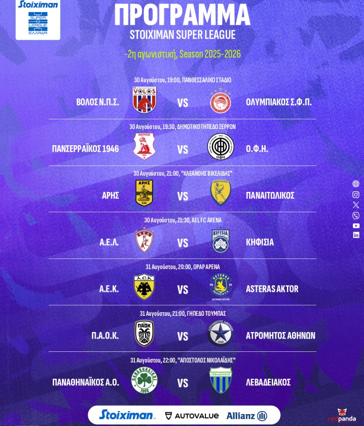 Την Κυριακή 31 Αυγούστου στις 20:00 θα υποδεχτεί η ΑΕΚ τον Αστέρα Τρίπολης, στα πλαίσια της δεύτερης αγωνιστικής, όπως ανακοίνωσε, σήμερα, η Super League.