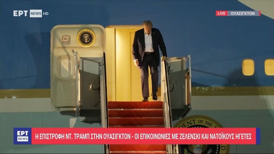 Στις ΗΠΑ επέστρεψε πριν λίγο ο Αμερικανός πρόεδρος Ντόναλντ Τραμπ μετά την πολύωρη συνάντηση που είχε στην Αλάσκα με τον Ρώσο ομόλογό του, Βλαντιμίρ Πούτιν. Εμφανώς κουρασμένος, ο πρόεδρος των ΗΠΑ κατέβηκε από το Air Force One, χωρίς να φορά τη γραβάτα του και με βλέμμα στραμμένο προς τα κάτω.