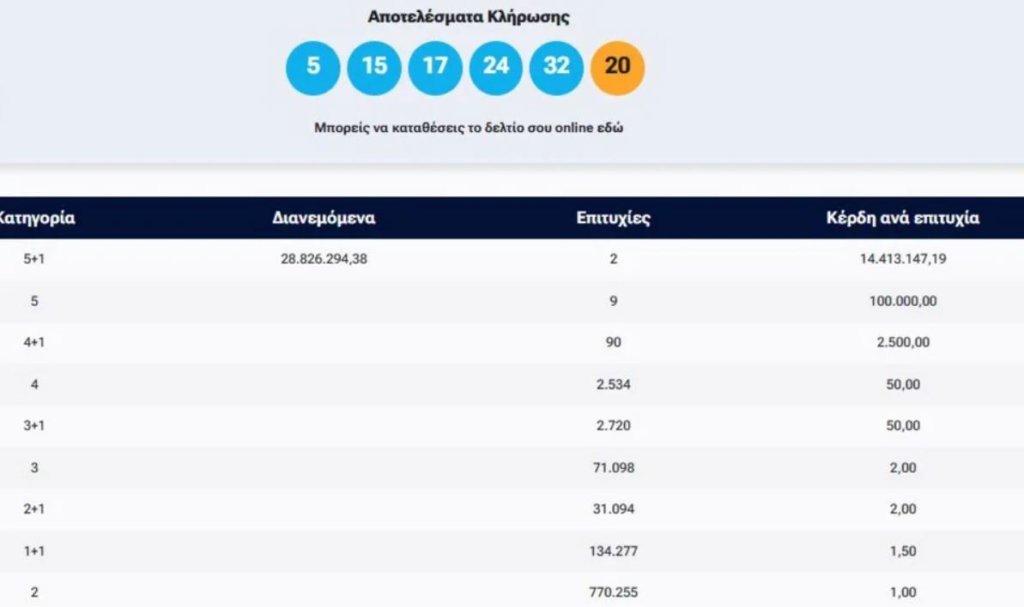 Οι αριθμοί που έβγαλε η αποψινή κλήρωση είναι: 5, 15, 17, 24, 32 και αριθμός τζόκερ το 20.