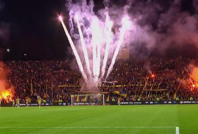 Στις αρχές του δεύτερου ημιχρόνου, μάλιστα δημιούργησαν ένα εντυπωσιακό pyro show με δεκάδες καπνογόνα και βεγγαλικά, προκαλώντας και την ολιγόλεπτη διακοπή του αγώνα για να καθαρίσει η ατμόσφαιρα.