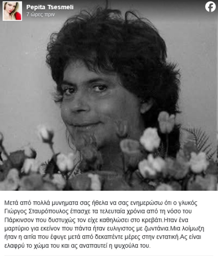 Πιο αναλυτικά, η Πέπη Τσεσμελή αναφέρει στη δημοσίευσή της: «Μετά από πολλά μηνύματα σας ήθελα να σας ενημερώσω ότι ο γλυκός Γιώργος Σταυρόπουλος έπασχε τα τελευταία χρόνια από τη νόσο του Πάρκινσον που δυστυχώς τον είχε καθηλώσει στο κρεβάτι. Ήταν ένα μαρτύριο για εκείνον που πάντα ήταν ευλύγιστος με ζωντάνια. Μια λοίμωξη ήταν η αιτία που έφυγε μετά από δεκαπέντε μέρες στην εντατική. Ας είναι ελαφρύ το χώμα του και ας αναπαυτεί η ψυχούλα του».