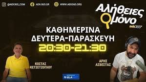 Έρχεται ζωντανά στις 20:30 η νέα εκπομπή του aek365 «Αλήθειες Μόνο». Κώστας Κετσετζόγλου, Άρης Ασβεστάς και οι ρεπόρτερ του aek365 αναλύουν, συζητούν για την μεγάλη ανατροπή στο Περιστέρι ενώ στο τραπέζι θα υπαρξουν και τα θέματα διαιτησίας και ολη την κιτρινόμαυρη επικαιρότητα...