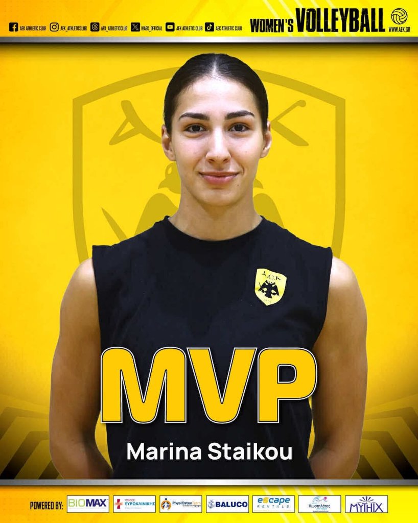 Η γυναικεία ομάδα βόλεϊ της ΑΕΚ πήρε την πρώτη νίκη στο Βαλκανικό Κύπελλο επί της Fit Fun Volley με 3-0 σετ και μετά το τέλος της αναμέτρησης έγινε γνωστή η MVP. Συγκεκριμένα, αυτή που κέρδισε τον τίτλο της κορυφαίας αθλήτριας στη νίκη της Ένωσης ήταν η 25χρονη πασαδόρος, Μαρίνα Στάικου.