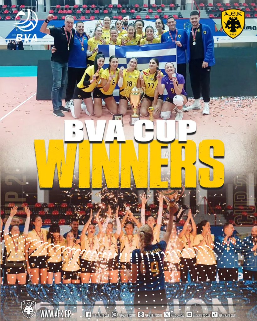 Η γυναικεία ομάδα βόλεϊ της ΑΕΚ έκανε το 3 στα 3 στο Βαλκανικό Κύπελλο και κατέκτησε το τίτλο, με την Ερασιτεχνική να γράφει στα social media. «Γράψατε ιστορία! Η οικογένεια της ΑΕΚ είναι υπερήφανη για εσάς!».