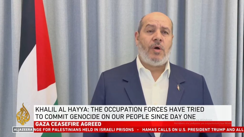 «Κηρύσσουμε το τέλος του πολέμου σήμερα και την έναρξη της μόνιμης εκεχειρίας», είπε ο Χαλίλ αλ Χάγια, σύμφωνα με το πρακτορείο Reuters.