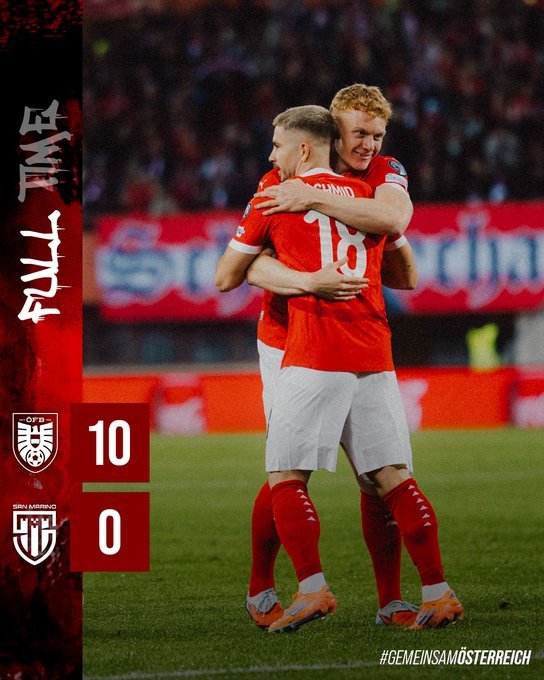 Απόλυτη παρέμενε η Αυστρία, που διέλυσε με 10-0 το Σαν Μαρίνο και βρίσκεται μόνη πρώτη.