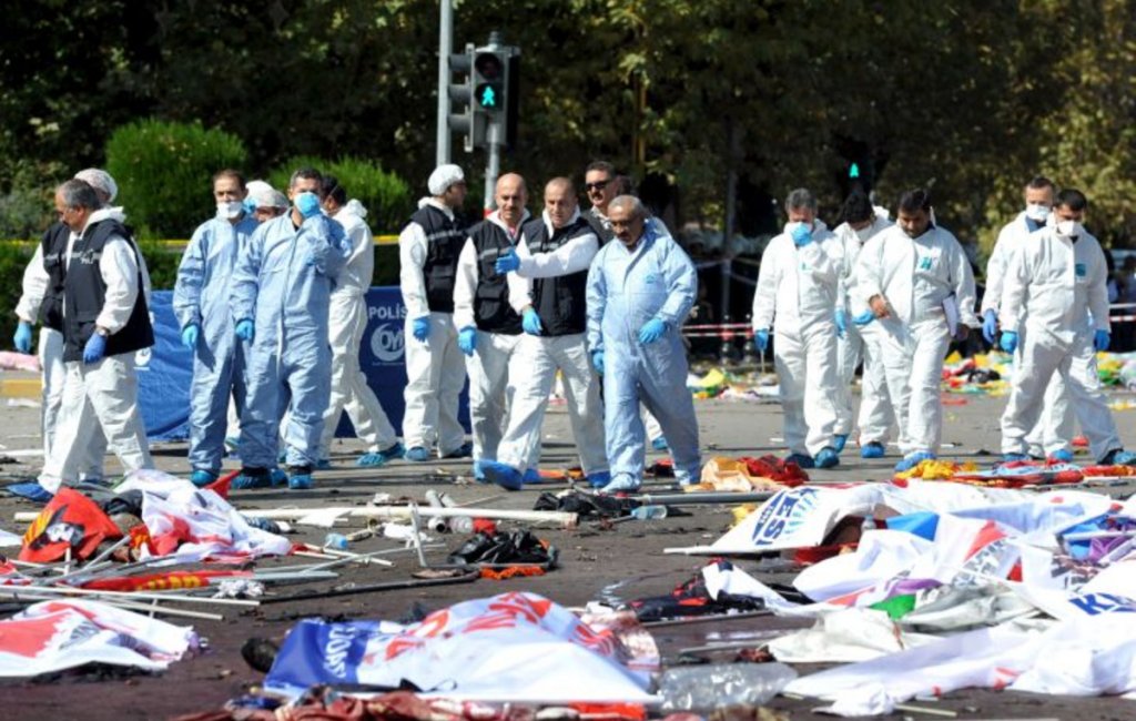 διπλή βομβιστική επίθεση στην Άγκυρα αφήνει 104 νεκρούς και πάνω από 400 τραυματίες με τα θύματα να κείτονται στο έδαφος καλυμμένα με αφίσες.