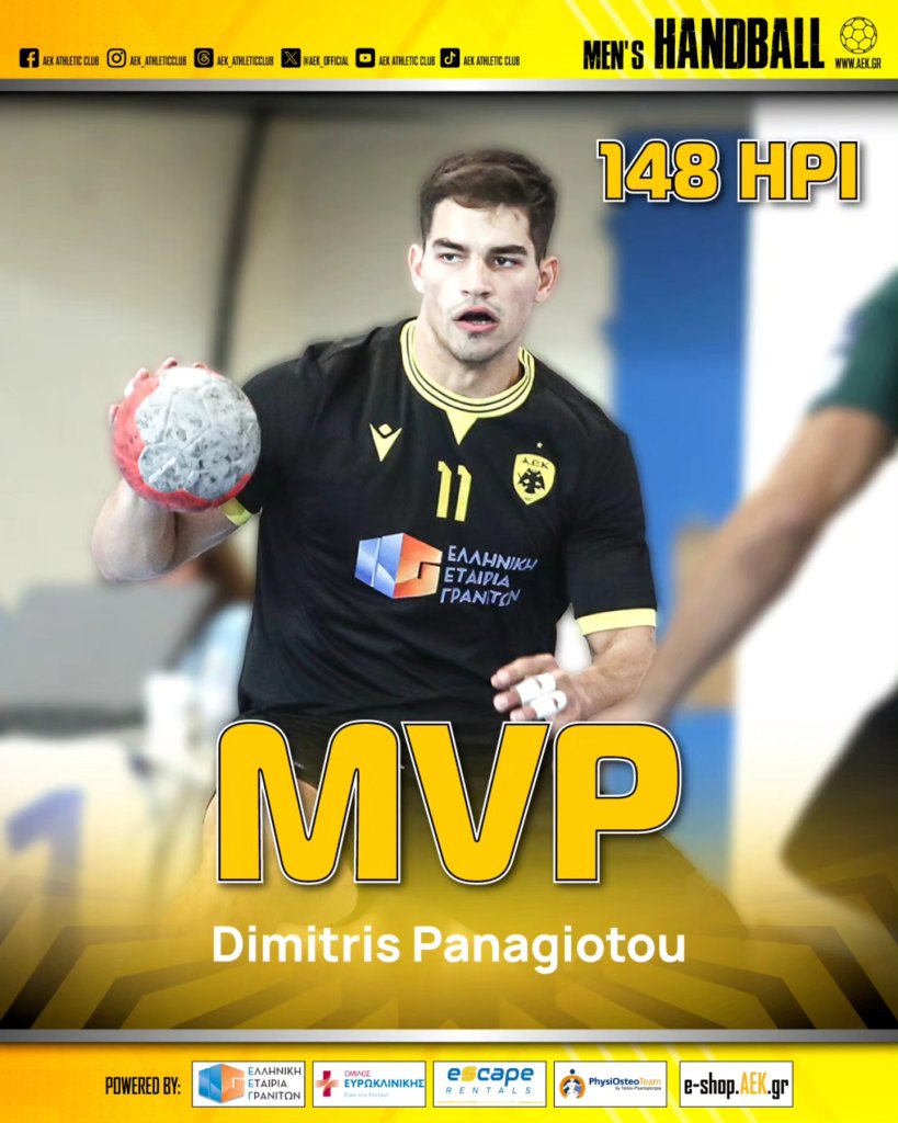 Η ομάδα χάντμπολ της ΑΕΚ ήταν επιβλητική απέναντι στον Διομήδη Άργους για την 5η αγωνιστική του Πρωταθλήματος της Handball Premier και μετά το τέλος της αναμέτρησης ο Δημήτρης Παναγιώτου ήταν αυτός που αναδείχθηκε κορυφαίος του αγώνα, εξαργυρώνοντας την καλή του εμφάνιση απέναντι στην ομάδα του Άργους.