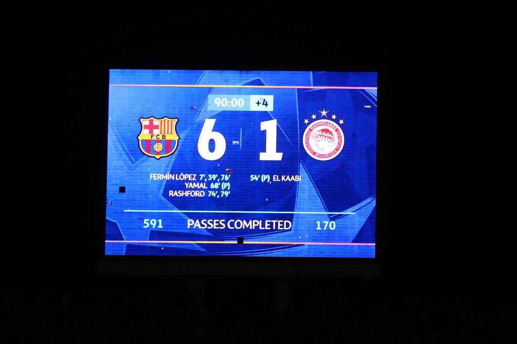 Στον λόφο του Μοντζουίκ ο Ολυμπιακός βίωσε έναν ποδοσφαιρικό εφιάλτη καθώς γνώρισε τη συντριβή με 6-1 από την Μπαρτσελόνα και έμεινε στον έναν βαθμό μετά από τρεις αγωνιστικές. Παρότι η ομάδα του Φλικ επέλεξε χαμηλό τέμπο και διατήρησε δυνάμεις για το επερχόμενο Clasicο, όταν έμεινε με παίκτη λιγότερο κυριάρχησε πλήρως.