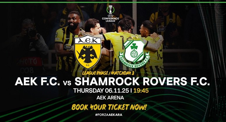 Η ΠΑΕ ΑΕΚ ενημερώνει ότι οι κάτοχοι εισιτηρίου διαρκείας που δεν έχουν προμηθευτεί το πακέτο εισιτηρίων των εντός έδρας αγώνων της League Phase του UEFA Conference League, μπορούν να διασφαλίσουν τη θέση τους για τον αγώνα με την SHAMROCK ROVERS FC, ο οποίος θα διεξαχθεί στην OPAP Arena την Πέμπτη 6 Νοεμβρίου στις 19:45.