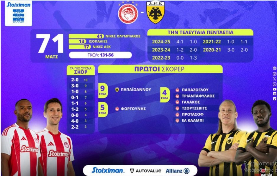 Χωρίς ισοπαλία έχουν ολοκληρωθεί οι εννέα τελευταίες αναμετρήσεις των δύο ομάδων για όλες τις διοργανώσεις και στις δύο έδρες. Η τελευταία τους ισοπαλία ήταν στις 17 Σεπτεμβρίου 2023 με γηπεδούχο την ΑΕΚ, ενώ με γηπεδούχο τον Ολυμπιακό ήταν στις 13 Νοεμβρίου 2022 με 0-0.