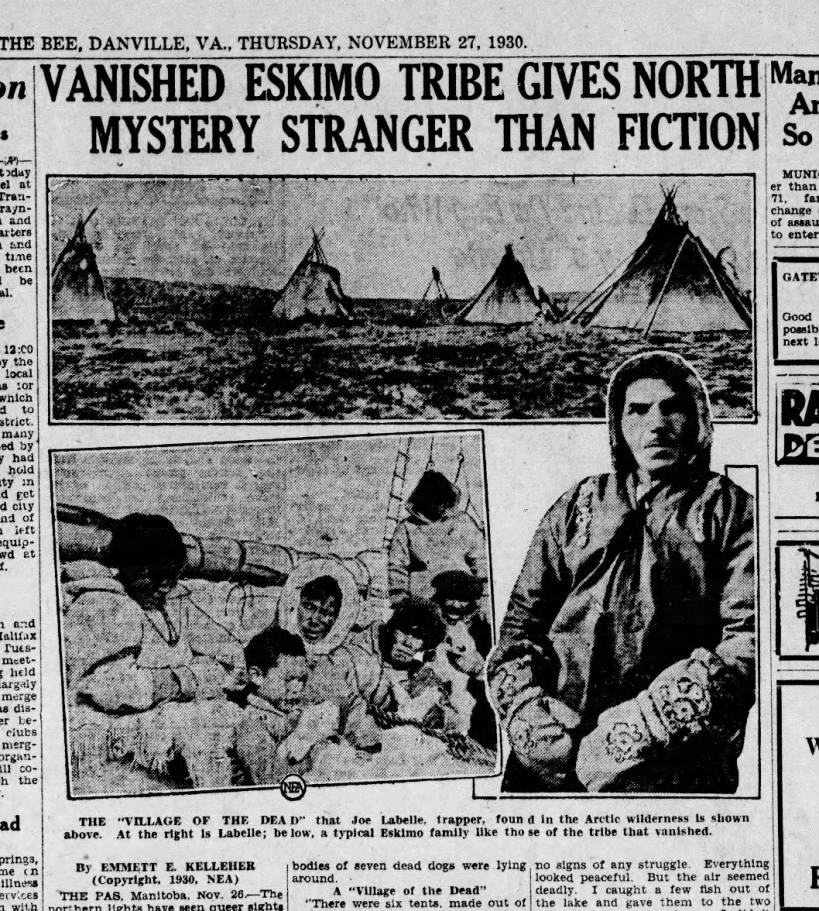 Στις 27 Νοεμβρίου του 1930, ένα άρθρο με την υπογραφή του Έμετ Ι. Κέλεχερ δημοσιεύθηκε στην εφημερίδα Danville Bee προκάλεσε αίσθηση. Ο τίτλος του ήταν: Η εξαφανισμένη φυλή Εσκιμώων δημιουργεί βόρειο μυστήριο πιο περίεργο από την φαντασία.