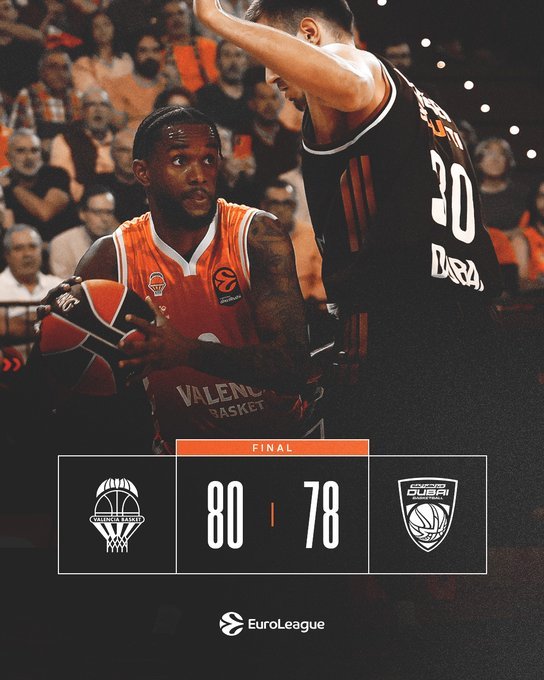 Η Ντουμπάι πήρε διψήφια διαφορά στα μέσα του τρίτου δεκαλέπτου (40-50), ωστόσο η Βαλένθια βρήκες τις λύσεις με τον Μουρ και πήρε σπουδαία νίκη με 80-78. Άστοχοι στο φινάλε Μπέικον και Μπερτάνς.