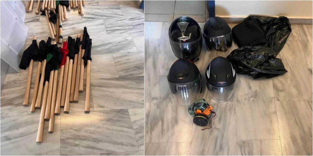 Οι αστυνομικοί εντόπισαν και κατέσχεσαν πυροσβεστήρες, κράνη, αντιασφυξιογόνες μάσκες, καδρόνια, ακόμα και ασυρμάτους, κατά την έφοδό τους, περίπου στις 5:30 το πρωί, για την εκκένωση της κατάληψης του κτιρίου «Ευαγγελισμός» στο Ηράκλειο Κρήτης.