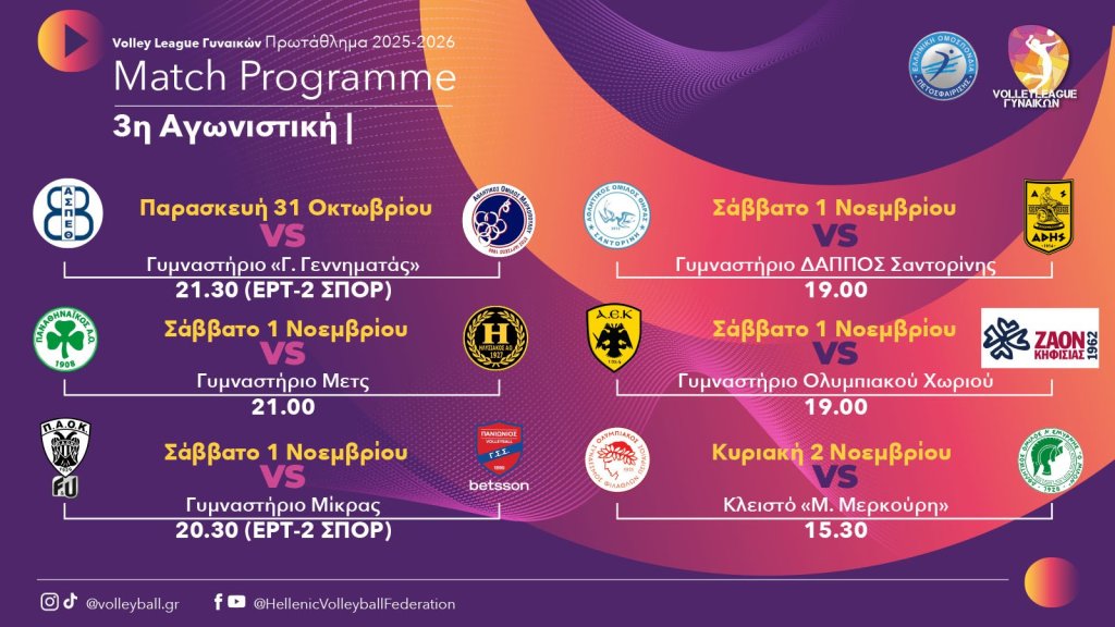Με τέσσερις αναμετρήσεις συνεχίζεται η 3η αγωνιστική του πρωταθλήματος της Volley League γυναικών, με την τηλεοπτική αναμέτρηση μεταξύ του ΠΑΟΚ F&U και του Πανιωνίου Betsson να ξεχωρίζει (1/11, 20.30 ΕΡΤ-2 ΣΠΟΡ).