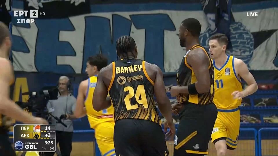 Ο Μπάρτλεϊ ενώ η ΑΕΚ ήταν πίσω στο σκορ με 14-11 στο 7ο λεπτό της αναμέτρησης με το Περιστέρι, πήρε την επίθεση πάνω του και με εξαιρετικό τρίποντο ισοφάρισε σε 14 - 14.