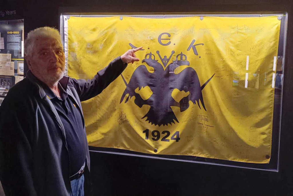 Μια πολύ ευχάριστη επίσκεψη δέχτηκε σήμερα το Μουσείο Ιστορίας της ΑΕΚ, από τον Μπάμπη Ψιμόγιαννο! Ο υψηλόσωμος επιθετικός, που αγωνίστηκε με επιτυχία στην Ένωση την τριετία 1961-1974 και ζει εκτός Αττικής, ξεναγήθηκε στις προθήκες του, υπέγραψε τη «Σημαία» των αθλητών της ΑΕΚ και ήπιε τον καφέ του στην πλατεία του Αετού, μαζί με φίλους της ομάδας. Ένας ποδοσφαιριστής - οπαδός της Ένωσης, που τίμησε τη φανέλα και άφησε μόνο φίλους.