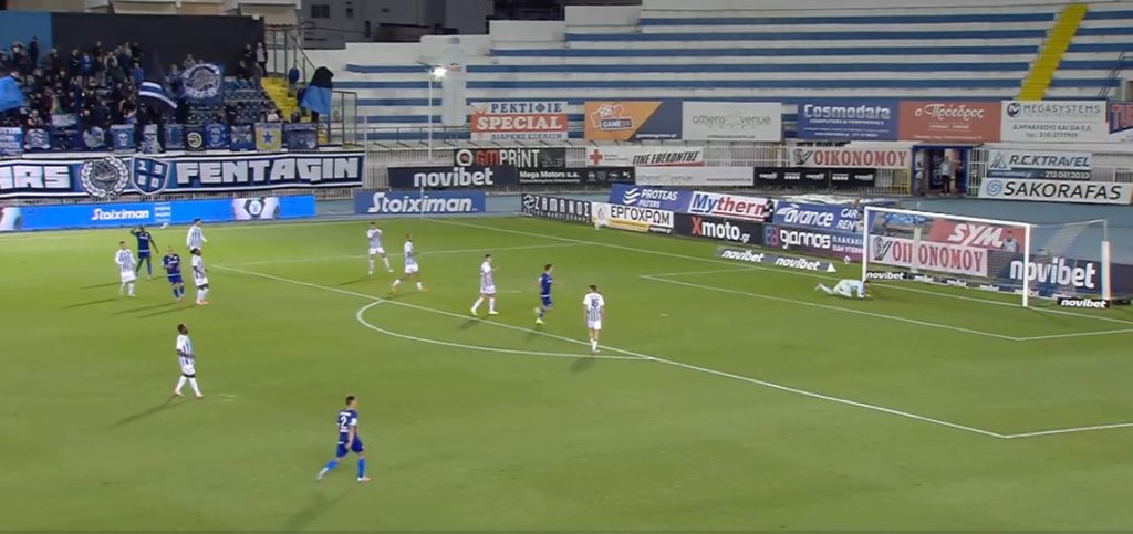 Στο 34’ το φοβερό μακρινό σουτ του Πόμπο έξυσε τα δοκάρια του Χουτεσιώτη.