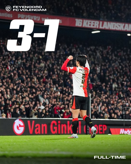 Ένα εύκολο βράδυ είχε η Φέγενορντ, η οποία κέρδισε με 3-1 τη Φόλενταμ και επέστρεψε στις νίκες, μία εβδομάδα μετά την ήττα στο ντέρμπι από την Αϊντχόφεν. Ο Ουέντα στο 19’ άνοιξε το σκορ για τους γηπεδούχους και ο Στέιν στο 26’ έκανε το 2-0. Ο Φέερμαν μείωσε σε 2-1 στο 58ο λεπτό με τον Ουέντα να κλειδώνει το τρίποντο στο 89’ για το 3-1. Ανέβηκε ξανά στην κορυφή, ως συγκάτοικος της Αϊντχόφεν, η ομάδα του Φαν Πέρσι.