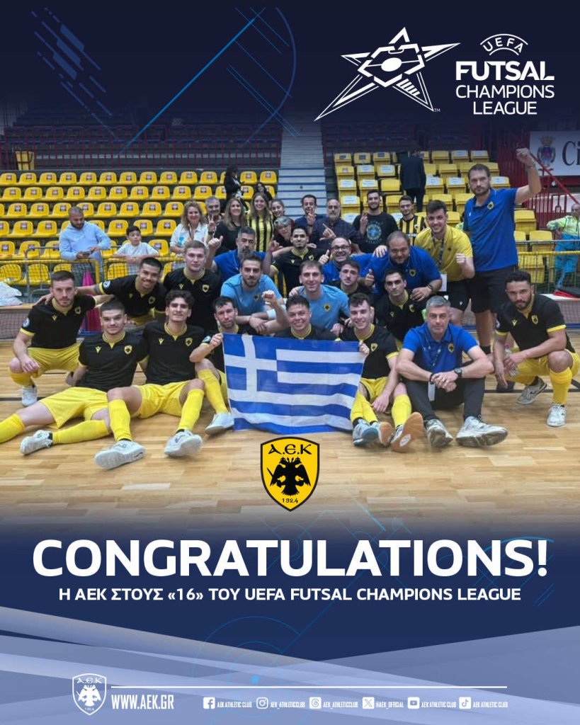 Η ομάδα ποδοσφαίρου σάλας της ΑΕΚ έκανε ακόμα μια μεγάλη εμφάνιση και πήρε μια επιβλητική νίκη με 9-2 επί της Γερμανικής Βέλιμντορφ για την 3η αγωνιστική του Main Round του UEFA Futsal Τσάμπιονς Λιγκ. Έτσι, μετά και το αποτέλεσμα του άλλου αγώνα του Ομίλου ανάμεσα σε Κατάνια και ΑΚΑΑ, η Ένωση τσέκαρε το εισιτήριο για τους «16» του UEFA FUTSAL Τσάμπιονς Λιγκ!