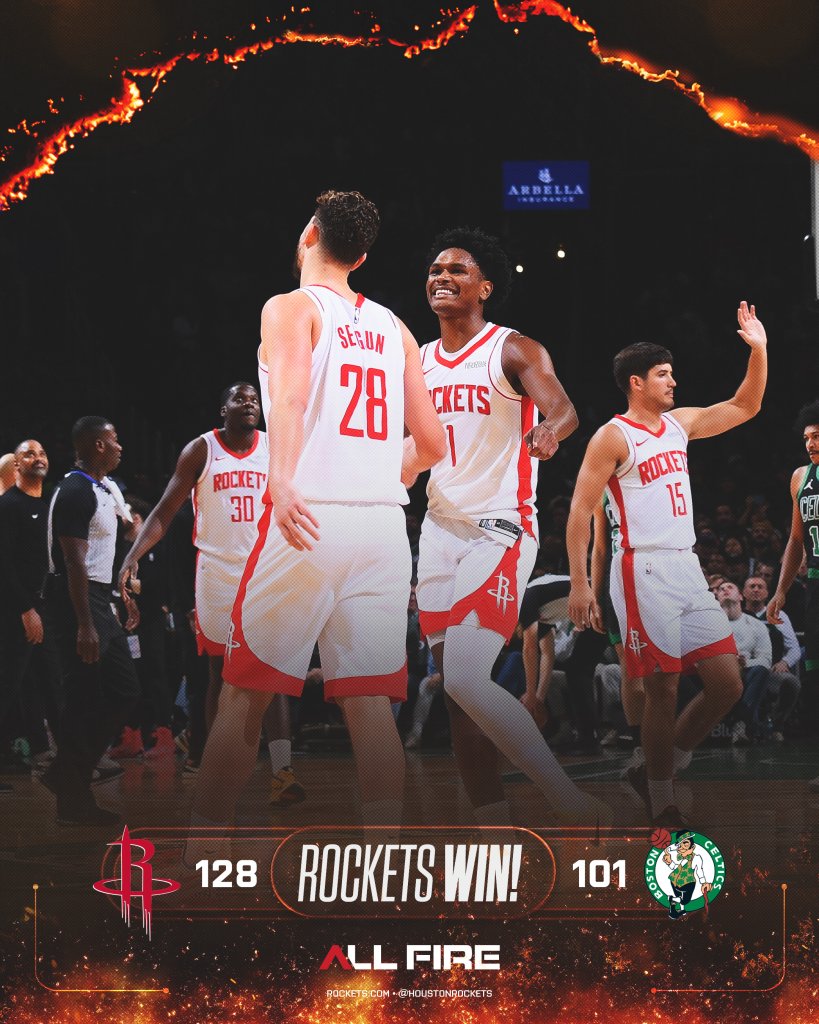 Στη Βοστώνη, οι Ρόκετς έφτασαν σε τρίτη σερί νίκη, βάζοντας τέλος στο αήττητο σερί τριών αγώνων των Σέλτικς. Με πρωταγωνιστή τον Κέβιν Ντουράντ, η ομάδα του Χιούστον επιβλήθηκε 128-101, παίρνοντας, από τα πρώτα λεπτά, τα ηνία του αγώνα. Ο 37χρονος φόργουορντ έβαλε 12 πόντους στη πρώτη περίοδο, η οποία ολοκληρώθηκε με τους Ρόκετς στο +13, 24-37. Στις δυο πρώτες περιόδους, οι φιλοξενούμενοι σούταραν με 57% και, στο τέλος του ημιχρόνου, προηγούνταν 48-66. Στα πρώτα λεπτά του τρίτου 12λεπτου, οι Σέλτικς χρεώνονταν με τεχνικές ποινές, οι παίκτες των Ρόκετς αξιοποιούσαν το μπόνους και η διαφορά ανέβηκε στους 24 πόντους, 50-74 στα 8:41 λεπτά για τη λήξη της περιόδου. Με το σκορ στο 72-97 στο 36ο λεπτό, η τέταρτη περίοδος είχε αποκτήσει τυπική διαδικασία, με τους φίλους των Σέλτικς να αποχωρούν πρόωρα και τους Ρόκετς να φτάνουν σε μια επιβλητική νίκη, 101-128.