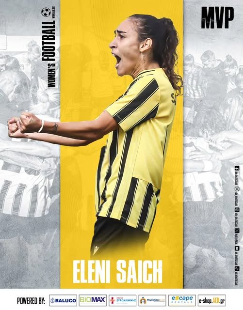 Η γυναικεία ομάδα ποδοσφαίρου της ΑΕΚ επικράτησε με 3-0 της Κηφισιάς και πήρε ακόμα ένα σημαντικό τρίποντο ενόψει των ντέρμπι που ακολουθούν με ΠΑΟΚ και Παναθηναϊκό. Σε αυτό το παιχνίδι για την 6η αγωνιστική του Πρωταθλήματος της Α Εθνικής για την καλή της εμφάνιση ξεχώρισε η Ελένη-Νικολέτα Σάιχ, που μετά το τέλος της αναμέτρησης κέρδισε τον τίτλο της MVP.