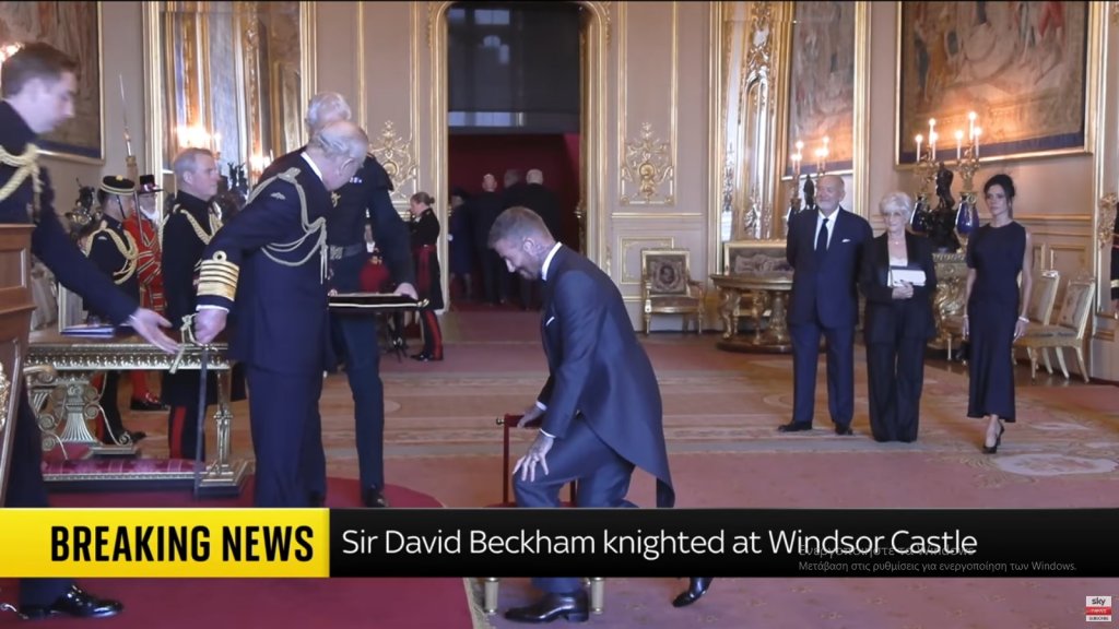 Ντυμένος με ένα κοστούμι που είχε φτιάξει ειδικά για την περίσταση η σύζυγός του, Βικτόρια Μπέκαμ, ο πρώην ποδοσφαιριστής έλαβε τον τίτλο του ιππότη για τις υπηρεσίες του στον αθλητισμό και τη φιλανθρωπία από τον βασιλιά Κάρολο.